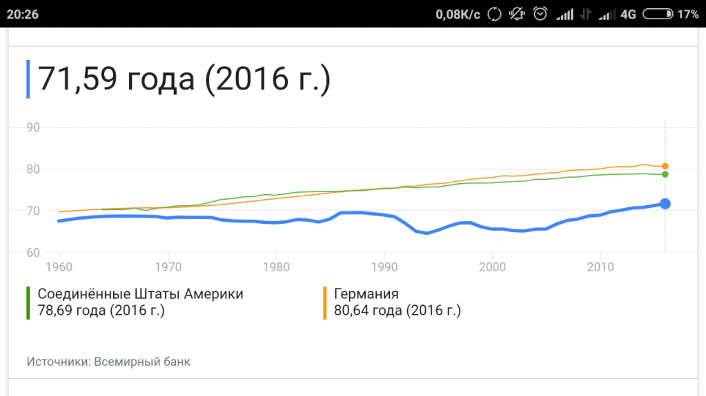 обратите внимание на источник, я, лично, склонен доверять международной статистике больше, чем вашим наблюдениям за жизнью вымирающего селаOlga1984: 22 ноя 2018, 20:10 Растет?Я стесняюсь спросить в какой стране растет?У нас в поселке очень много умирает в молодом возрасте.На кладбище молодых,больше чем пожилых,в большинстве случаев люди даже до пенсии не доживают,а Вы говорите продолжительность жизни растет,я больше верю очевидному,чем статистике,которую нам правительство предоставляет