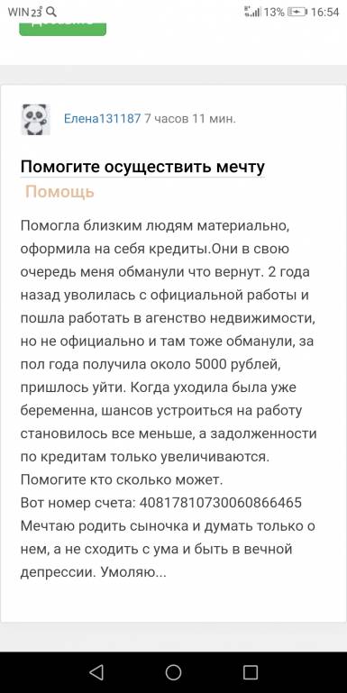[quote=Cvetlana post_id=52965 time=1565909426 user_id=4471] Я конечно мало верю что есть такие люди! Но у очнётся верить! Мне тоже нужна помощь много не прошу,сколько сможете [/quote]