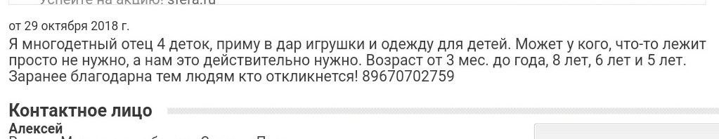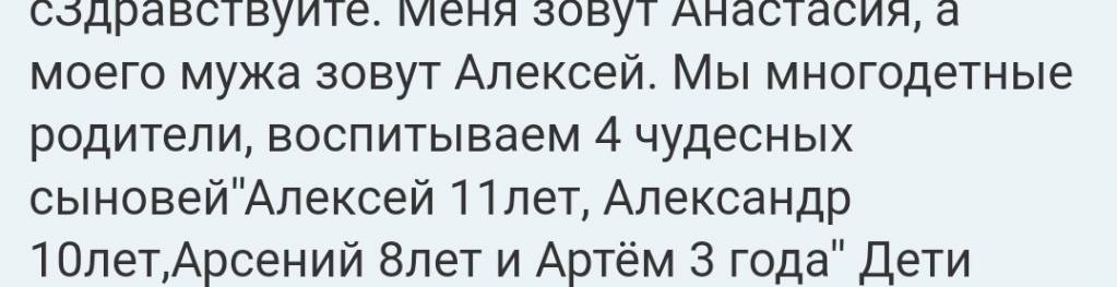 сЗдравствуйте. Меня зовут Анастасия, а моего мужа зовут Алексей. Мы многодетные родители, воспитываем 4 чудесных сыновей''Алексей 11лет, Александр 10лет,Арсений 8лет и Артём 3 года'' Дети учатся в школе и посещают детский сад. Мы не можем получить причитающееся в Москве жилье и вынуждены жить и скитатся на съёмной квартире в Сергиевом Посаде. Работает только муж, в службе курьерской доставки, так как в его возрасте(52г)сложно найти достойную работу. Я занимаюсь детьми и домом. Доходы нашей семьи - не стабильная заработная плата супруга(24-26000)и детские пособие 22.159.Из них мы оплачиваем аренду квартиры (17.000), ежемесячно погашаем задолженность по кредиту, которую брали на подготовку детей к школе.,оставшиеся денег еле хватает на продукты. На данный момент возможности выйти на работу я не имею, так как младшие дети часто болеют и все моё время уходит на уход за всеми детьми. Раннее благотворительные организация мы не обращались, всегда старались сами достойно обеспечивать своих детей.Но,сложившейся ситуации мы вынуждены обратиться к вам за помощью. Дело в том, что на днях мои родственники без моего ведома выписали меня из родительской квартиры, лишив тем самым нас возможности получать детские пособие. На улице похолодало, дети стали чаще болеть, им нужны новые тёплые вещи, школы и садик постоянно требуют денежные средства на различные нужды. Именно сейчас нам с мужем нужна поддержка, так как ни кто из родственников нам не помогает. Мне очень не удобно писать вам все это, но мы очень надеемся на любую вашу помощь, будем благодарны за любую поддержку - материальную, в виде вещей и мебель для детей, юридической консультации, добрых слов и советов. Спасибо. С уважением Анастасия и Алексей.