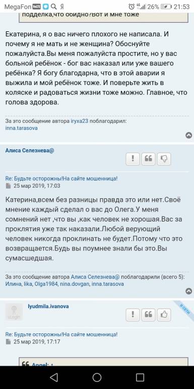 Отправлено спустя 1 минуту 18 секунд:Ира не нужно из меня делать дуру,вы первая об этом написали а я вам по факту ответилаiryxa23: 28 мар 2019, 22:01 , Я вам написала после того как вы мне написали, - "" тебя Бог уже наказал видимо естьиза что, ты не мать и не