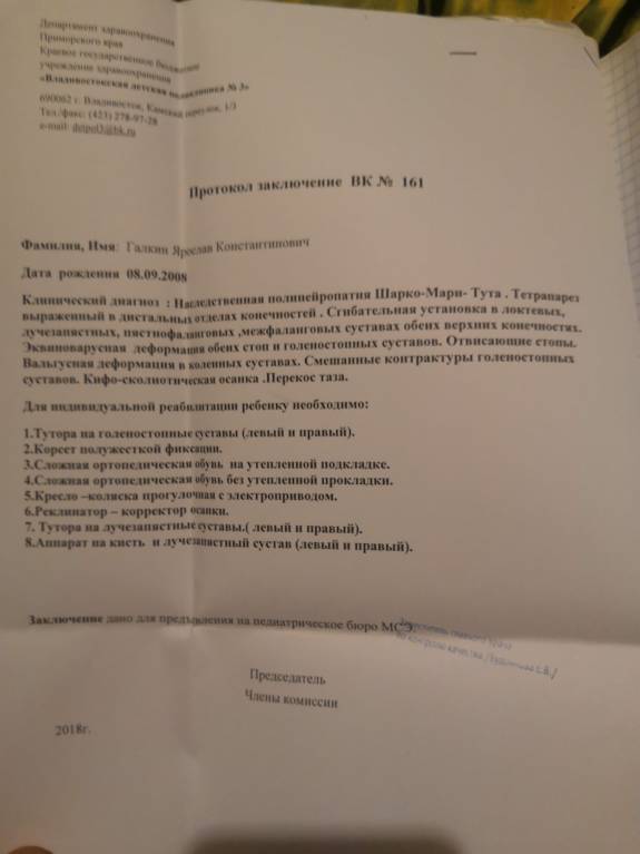 Моему сыну 9 лет и он серьезно болен, диагноз полинейропатия Шарко-Марри-Тута это отмирание мышц, ему в Москве прописали ряд реабилитационной техники таких как коляска, аппараты на ноги, сложная ортопедическая обувь, и есть там аппарат на лучезапястный сустав и кисть на обе руки. Нам сказали что выдадут всё кроме этих аппаратов, так как они не входят в бесплатную раздачу.