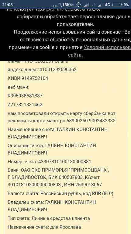 Первое что на белом фоне это наше там и адрес наш и телефон мой, то что цветное если посмотреть внимательно, то фамилия даже не та, это раз во вторых Ольга галкина это моя супруга, она инваоил колясочник на фото она с Ярославом, Ярик у неё на руках, она никогда не писала, аишу всегда я от своего имени и от имени всей семьи. Я кстати вчера про это и писал, что доки не хрчу сюда выеладывать именно по этому. Второй скрин это не мы.