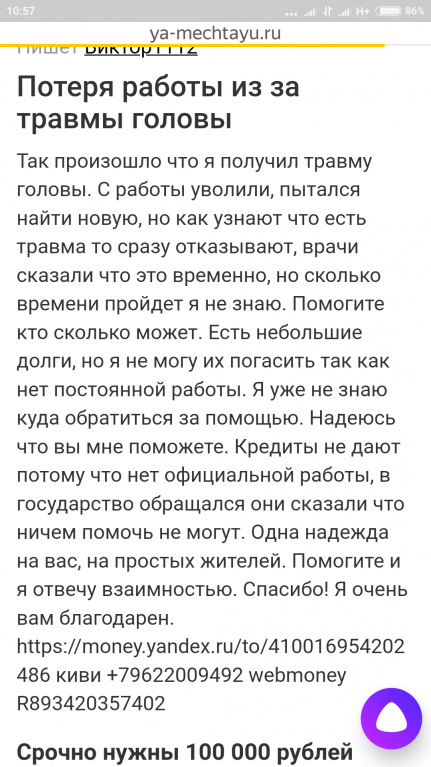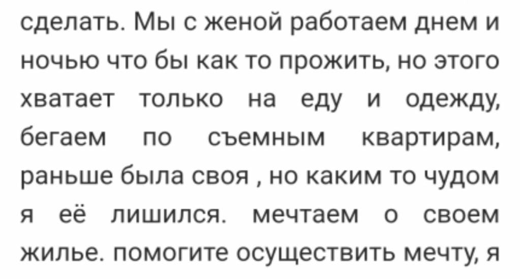 Вы будете раздаривать квартиры дыркам, а мы вам их покупать? Это прикол такой?Как произошло что я получил травму головы. С работы уволили, пытался найти новую, но как узнают что есть травма то сразу отказывают, врачи сказали что это временно, но сколько времени пройдет я не знаю. Помогите кто сколько может. Есть небольшие долги, но я не могу их погасить так как нет постоянной работы. Я уже не знаю куда обратиться за помощью. Надеюсь что вы мне поможете. Кредиты не дают потому что нет официальной работы, в государство обращался они сказали что ничем помочь не могут. Одна надежда на вас, на простых жителей. Помогите и я отвечу взаимностью. Спасибо! Я очень вам благодарен https://money.yandex.ru/to/410016954202486 webmoney R893420357402