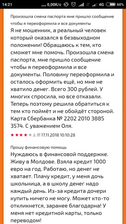 Блин, у вас жизнь прямо кипит: то паспорт, то дрова, то мошенник развел:Доброго времени суток!я не мошенник а реальный человек который оказался в безвыходном положении!обращаюсь к том кто сможет мне помочь так как в связи с тем что произошла смена паспорта мне пришло сообщение чтоб я переоформила и все документы.половину переоформила и осталось оформить ещё но мне не хватило денег всего 300 рублей и не к кому обратиться за помощью так как у многих спросила но все отказали.теперь поэтому решила обратиться к тем кто поймёт и не обойдёт стороной и поможет мне.карта сбербанк России № 2202 2010 3885 3574 буду очень благодарна всем кто сможет помочь мне!с уважением Оля!