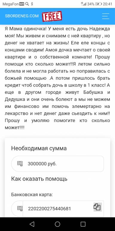 Я МАМА одиночка! У меня есть дочь Надежда моя! Прошу помощи кто сколько может помогите просто на жизнь не хватает! Дочке надо куртку купить и обувь ! И Еще доча моя мечтает к бабушки и Дедушки в Саратов в гости на новый год но нам не хватает на это денег! Прошу помогите просто кто сколько может карта сбербанк 2202200275440681