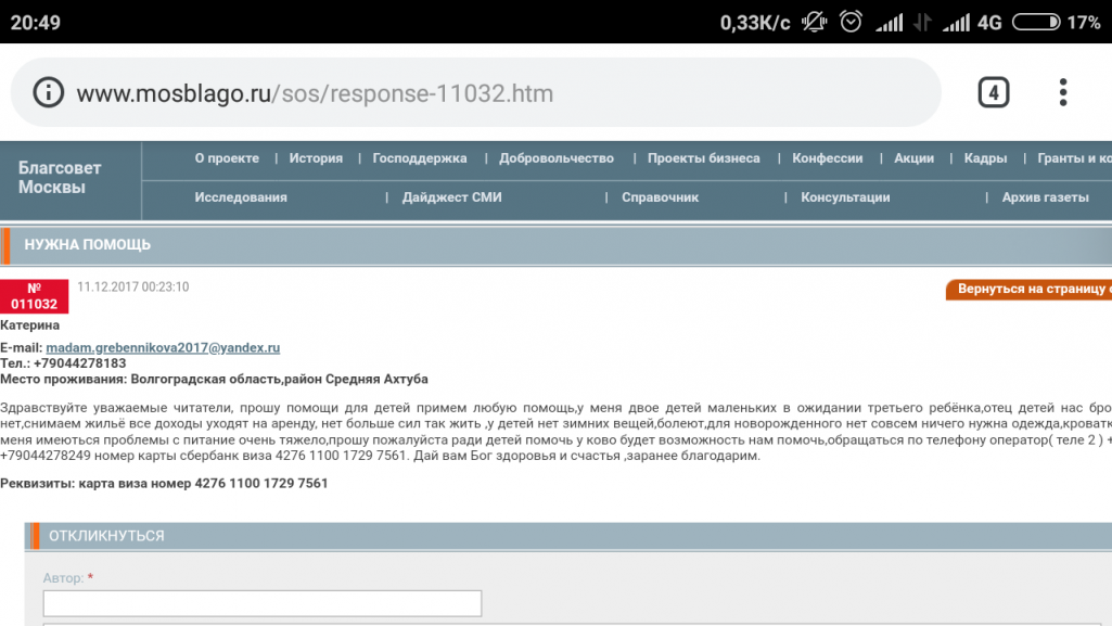 Здравствуйте уважаемые читатели, прошу помощи для детей примем любую помощь,у меня двое детей маленьких в ожидании третьего ребёнка,отец детей нас бросил,своего жилья нет,снимаем жильё все доходы уходят на аренду, нет больше сил так жить ,у детей нет зимних вещей,болеют,для новорожденного нет совсем ничего нужна одежда,кроватка,коляска,также у меня имеються проблемы с питание очень тяжело,прошу пожалуйста ради детей помочь у ково будет возможность нам помочь,обращаться по телефону оператор( теле 2 ) +79047547523 Или +79044278249 номер карты сбербанк виза 4276 1100 1729 7561. Дай вам Бог здоровья и счастья ,заранее благодарим.
