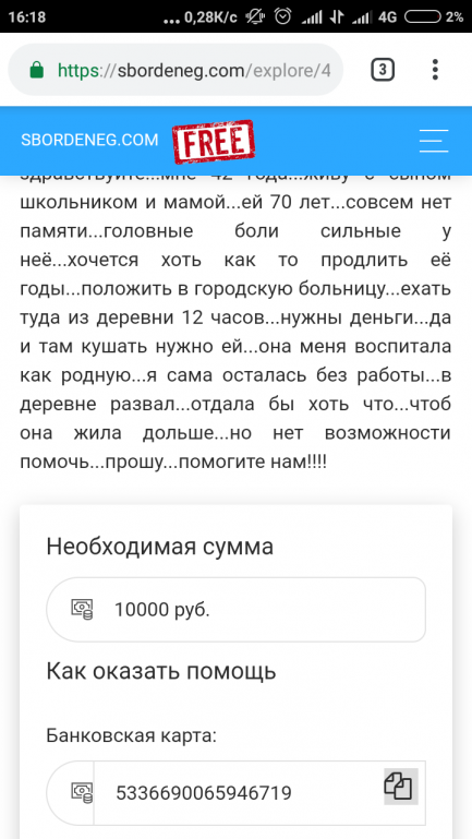 в нашем селе нет работы, а у меня сын и мама. Ей 76 лет, сильно болеет, а у меня кроме них никого нет. Нужны дорогие лекарства, совсем нет памяти у мамы и падает при ходьбе. Откликнитесь добрые люди, хоть купить самые необходимые лекарства. Я бы всё отдала чтоб продлить ей жизнь. Она меня воспитала когда родная мать бросила младенцем меня. Прошу, откликнитесь, нужны 6 тыс.руб. Номер карты 5336690065946719