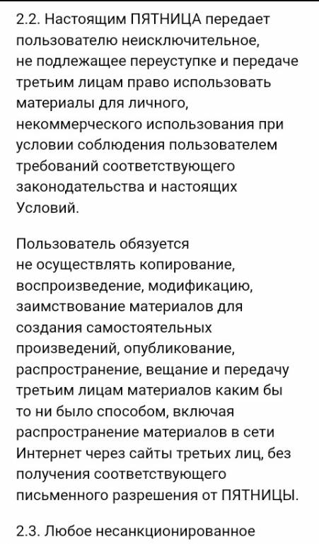 2.1. Официальный логотип ПЯТНИЦА (далее — Логотип) является зарегистрированным товарным знаком ООО «Телекмопания ПЯТНИЦА» права на который защищены соответствующими нормами законодательства.