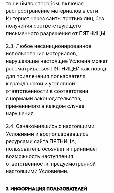 Любое несанкционированное использование Логотипа, нарушающее настоящие Условия, может рассматриваться ПЯТНИЦЕЙ как повод для привлечения нарушителя к гражданской и уголовной ответственности в соответствии с нормами законодательства, применимого в каждом случае нарушения.