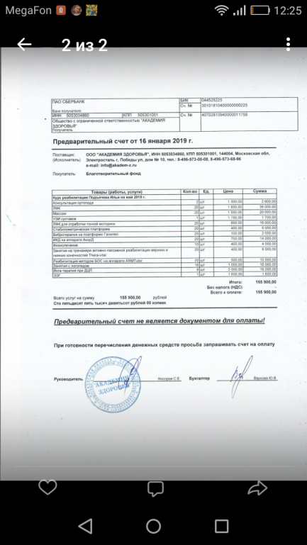 Ну и что это? Счет, где покупатель - Благотворительный фонд, а поставщик - ООО Академия Здоровья. Где связь с ребенком? При чем тут благотворительный фонд и почему он не оплачивает реабилитацию?