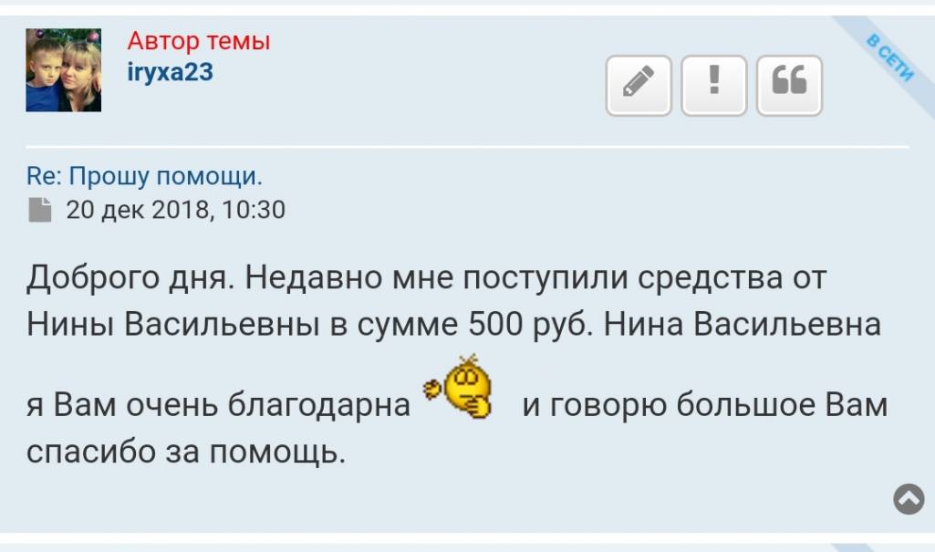 Нина Васильевна в декабре Вы мне помогли. Я помню как Вы мне позвонили и сказали:-Ирина, я вам там перевела немного и пожелали здоровья. Я помню всех кто мне помог и стараюсь не забывать добро. А вчера Вам позвонила, чтобы немного поддержать хотя бы словом.