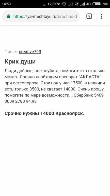 Пожалуйста, помогите ста рублями на еду. Очень тяжёлое положение, кушать хочется(( Я не алкаш, не лентяй.. Но так случилось, что фирма, в которой работал, обанкротилась. Работы лишился. На остаточные деньги оплатил ипотеку и коммуналку. Остался ни с чем, даже на маршрутку денег нет. Мне 59 лет, сложно найти работу. Руки от безысходности опускаются.. Прошу тех кто может помочь, помогите по мере возможности.