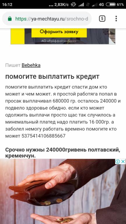 @andrey.belyakov: 10 мар 2019, 15:35 ребята я с украины попал в ситуацию взял кредит на 1500000 на жилье выплатил уже подчи осталось 240000 гривень и получилось что понизили зарплату надо платить 21000 а я могу платить 15000 если есть возможность одолжить или помочь я работаю я одам просто незнаю как быть может даде совет какой подскадете