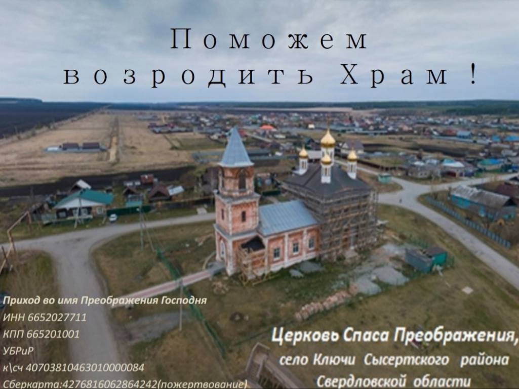 Поможем возродить храм деревня Ключи Свердловс.обл.,а так же построим духовно-просветительский центр ,для детей .Очень нужны спонсоры,благотворители,пишите,звоните,всё обсудим.Спаси Господи! ( почта janna@[email protected]).