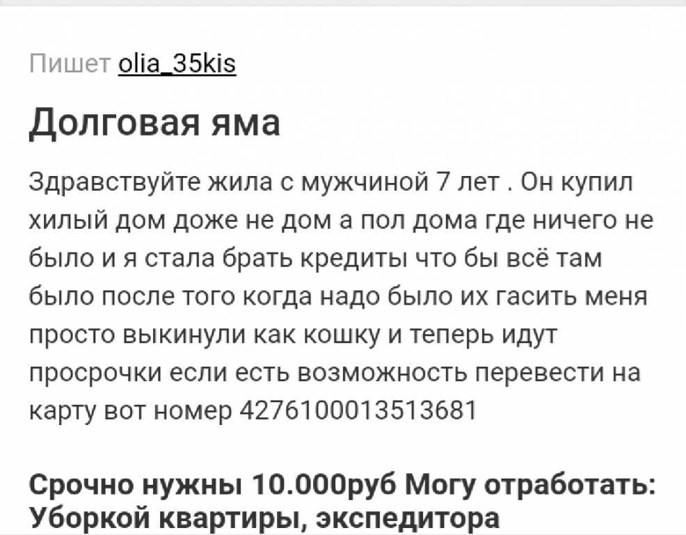 Пожалуйста Каму не трудно помочь просрочка по кредиту надо 3 000р. Если есть возможность перевести на карту 4276100013513681