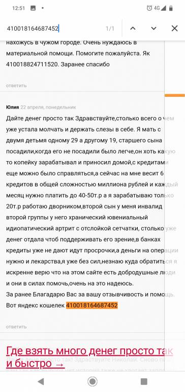 Здравтсвуйте,надеюсь есть добродушные люди,остались еще такие на этом белом свете? Я инвалид второй группы у меня ..... Прошу,нет,взываю о помощи вашей... У меня мама повязла в кредитах,я не работаю получаю пенсию инвалидну,все деньги уходят на погашение кредитов,дома даже бывает поесть нечего. А мне так же необходимы лекарства,каждый две неделе ездием на прием к врачу в другой город потому что у нас в городе врачи как бы так помягче сказать глуповатые. Низнаю,помогите кто чем может вот номер яндекс кошелька 410018164687452