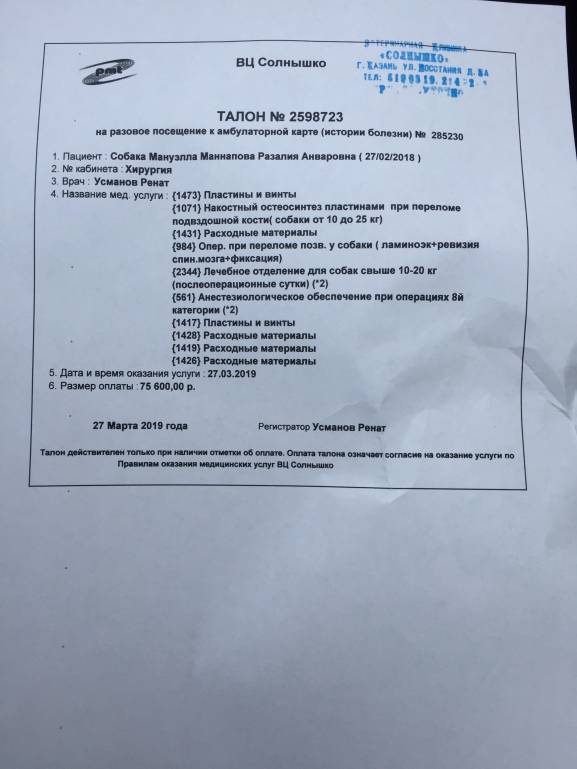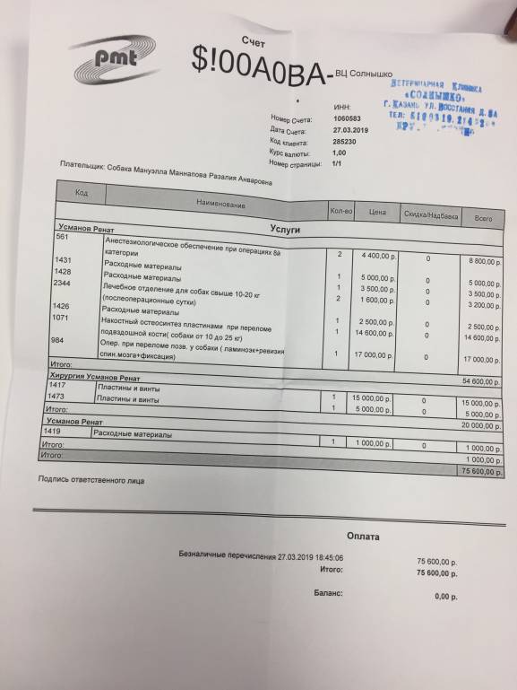 В итоге, нас отправили в Казань, мы поехали в Казань, нам выставили такой счёт, мы были в шоке, не знали, что делать, погрузили собаку и поехали обратно домой, и когда мы уже выезжали из Казани, эта женщина нам звонит, и спрашивает, как обстоят дела. Остановившись, рассказав всю ситуацию и проблему, сказали, что будем открывать сборы в фондах, как соберём эту сумму, тогда и запишемся, она заставила вернуться нас, так как тянуть время нельзя, пока не срослось, она сказала, что всё оплатит, а как деньги соберём, то вернём