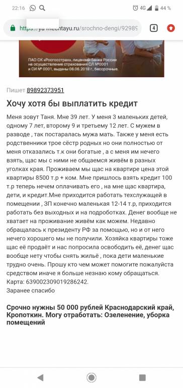 Меня зовут Таня. Мне 39 лет. У меня 3 маленьких детей, одному 7 лет, второму 9 и третьему 12 лет. С мужем в разводе , так постаралась мужа мать. Также у меня есть родственники трое сёстр родных но они полностью от меня отказались т.к они богатые , а с меня им нечего взять, щас мы с ними не общаемся живём в разных уголках края. Проживаем мы щас на квартире цена этой квартиры 8500 т.р + ком. Мне пришлось взять кредит 100 т.р теперь нечем оплачивать его , на мне щас квартира, дети, и кредит.Мне приходится работать техслужащей в помещении , ЗП конечно маленькая 12-14 т.р, приходится работать без выходных и на подроботках. Денег вообще не хватает на проживание живём как можем. Недавно обращалась к президенту РФ за помощью, но и от него нечего хорошего мы не получили. Хозяйка квартиры тоже щас её продаёт и нас попросила освободить её, денег щас вообще нету чтобы снять жильё , пока дети маленькие трудно очень. Прошу кто чем может помогите пожалуйста средством иначе я больше незнаю кому обращаться.