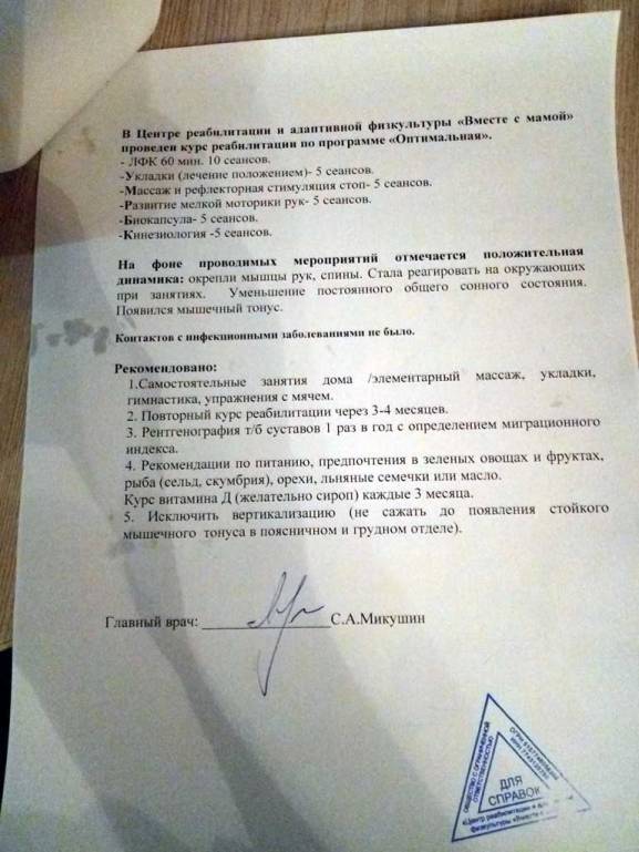 Общими усилиями оплачена первая реабилитация! Занятия прошли с 25.04.2019 по 08.05.2019. Спасибо за оказанную посильную помощь! Просим Вас по возможности периодически промогать на лечение ребенку так как реабилитации требуются постоянные, каждые 2-4 месяца. В среднем около 5 раз за год. Конечно такое финансовое бремя очень тяжелое для любой семьи оказавшейся в такой безвыходной ситуации. Без контроля и помощи специалистов реабилитологов к сожалению детям с диагнозом ДЦП не социализироваться.