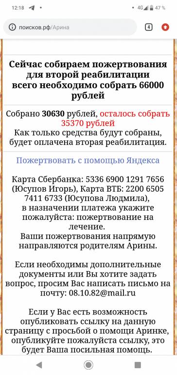 Просим Вас оказать посильную помощь Арине. Мы изыскиваем средства как можем.