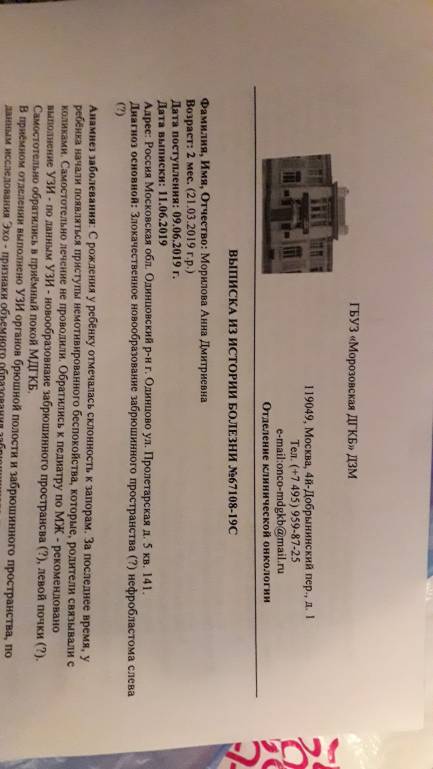 Мы нашли другую больницу хотели что бы нам сделали перевод на зав отделением отказался пришлось писать отказнкую и брать выписку в другой больнице нам сделали кт и в четверг уже назначили операцию химию нам делать нельзя так как она ещё маленькая сказал лечащий врачь .