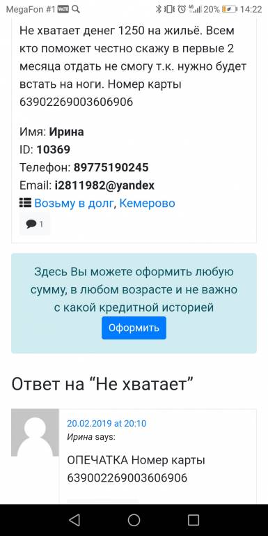 Не хватает денег 1250 на жильё. Всем кто поможет честно скажу в первые 2 месяца отдать не смогу т.к. нужно будет встать на ноги. Номер карты 63902269003606906