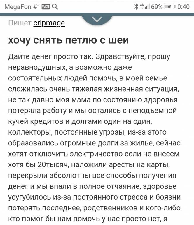 liamage: 28 июл 2019, 00:31 Здравствуйте, прошу помогите, в моей семье тяжелая ситуация во всех планах, чтоб устроиться на работу пришлось занять 2 тысячи рублей у знакомого, потому что родственники не могли мне помочь, у нас куча долгов и кредитов, я просто пытаюсь найти работу чтобы вылезти из этого, но все против меня, человек уже угрозами требует назад эти 2 тысячи, умоляю помогите хоть любой суммой, я буду очень благодарна, уже не знаю что делать, это мой последний шанс. мой яндекс кошелек 410019088289894
