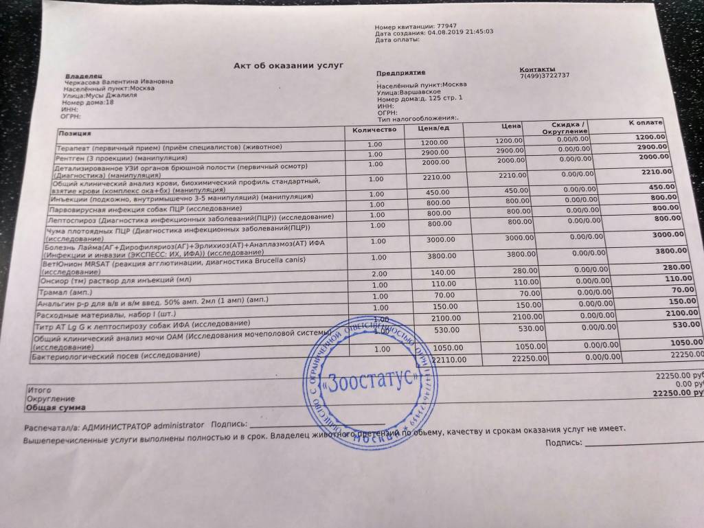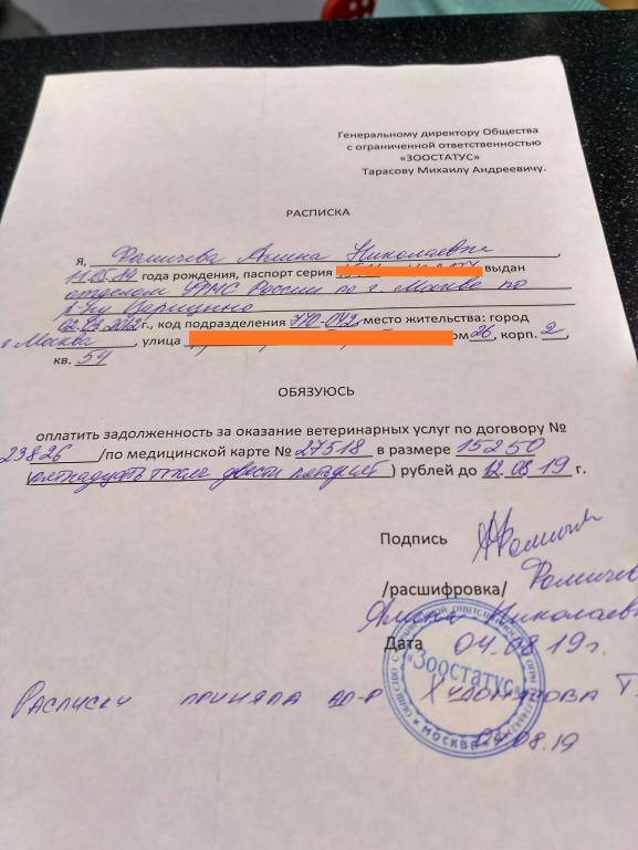Расписка долговая это "не вкладываясь самому", любопытная логика у Kysh. По поводу тарифов "завышенных" всегда можете обратиться с претензиями в ветклиники. Кроме долга, ещё есть дальнейший план лечения, для этого требуются дополнительные обследования.