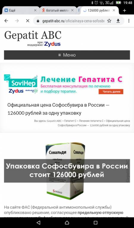 Индийский лицензионный аналог стоит 49900р https://sovihep.ru/?utm_source=gepatit_ ... t_how_muchЕгор 051187: 03 сен 2019, 22:27 У меня гепатит с нужны деньги на покупку лекарств они стоят 126000 т.р