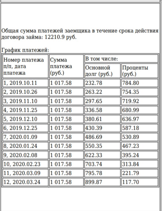 Вот для ознакомление график платежей,это за то что я взял 6000руб(после обновлений данных),оплатил за свет,так,что за коммунальные услуги я ничего не должен,крупные долги погасил(так,что долгов у меня нет,будут только текущие платежи,за свет будет очень мало,так как я там редко бываю и пользуясь только электрочайником),а с этим займам справлюсь своими силами,теперь я его должен гасит два раза в месяц минимальная сумма 1017руб+3% и получается примерно 1048руб,