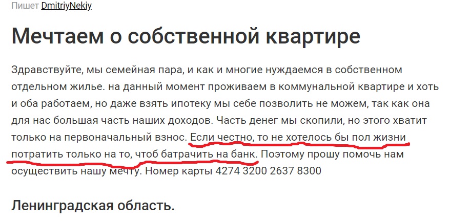 а посторонним людям типа очень хочется батрачить на то, чтобы какому-то мужику и его бабе не пришлось расплачиваться за ипотеку)) осеннее обострение началось?dmitriy.nekiy: 07 окт 2019, 15:29 Здравствуйте. Я понимаю, что по стране тысячи подобных семей, поэтому не буду особо на что-то жаловаться, но просто попрошу помочь нашей семье с мечтой о своей квартире. Мы оба работаем, но ипотеку нам не потянуть. Родственников нет, поэтому на их помощь рассчитывать не приходиться. Нет, мы не говорим, что нам нужна помощь больше всех и какая-то существенная, но и просто какая-нибудь копейка приблизит нас к осуществлению нашей мечты. У нас есть свои небольшие накопления, но этого не хватит даже на первоначальный взнос на ипотеку. Поэтому, кому не жалко, просим помочь. Переводить можно на карту 4274 3200 2637 8300.