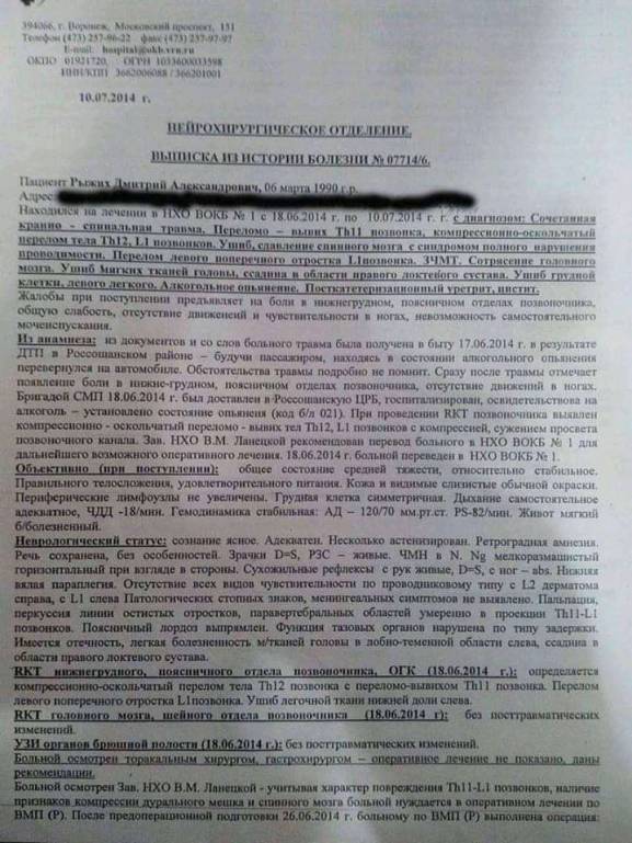 Мой диагноз: переломо-вывих Th11, компрессионно-оскольчатый перелом Th12 и L1. Нарушение проводимости ниже травмы вследствие сдавливания спинного мозга (парализован ниже пояса). Нарушение работы тазовых органов.