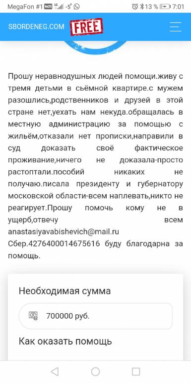 Так сделайте временную регистрацию там, где живёте. Вы не работаете? Алименты не получаете?anastasiya.vabischevich: 01 дек 2019, 23:56 Сама отправляла пожертвования и не проходила мимо просящих.Теперь прошу сама.Воспитываю двоих своих детей и племяницу.С мужем разошлись,родственников и друзей нет.Живём в сьёмной квартире за которую надо ежемесячно платить.Пособий не получаю нет прописки.Что и как дальше ума не приложу.Обращалась куда только можно всем наплевать.В отчаянии это мягко сказано.Если кому то не будет в ущерб буду очень благодарна карта сбер.4276400014675616 Анастасия отвечу всем [email protected] Благодарю заранее.