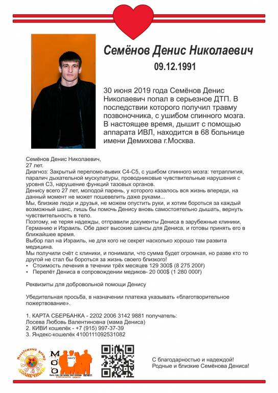 29 июня 2019 года, с моим сыном, Семеновым Денисом Николаевичем (27 лет) случилось несчастье, он попал в страшное ДТП. В результате которого, получил серьезные травмы для своего здоровья, а именно, закрытую позвоночно -спинномозговую травму С4- С5 позвонков с повреждением спинного мозга, паралич дыхательной системы (Денис с момента аварии по сегодняшний день находится на аппарате ИВЛ).
