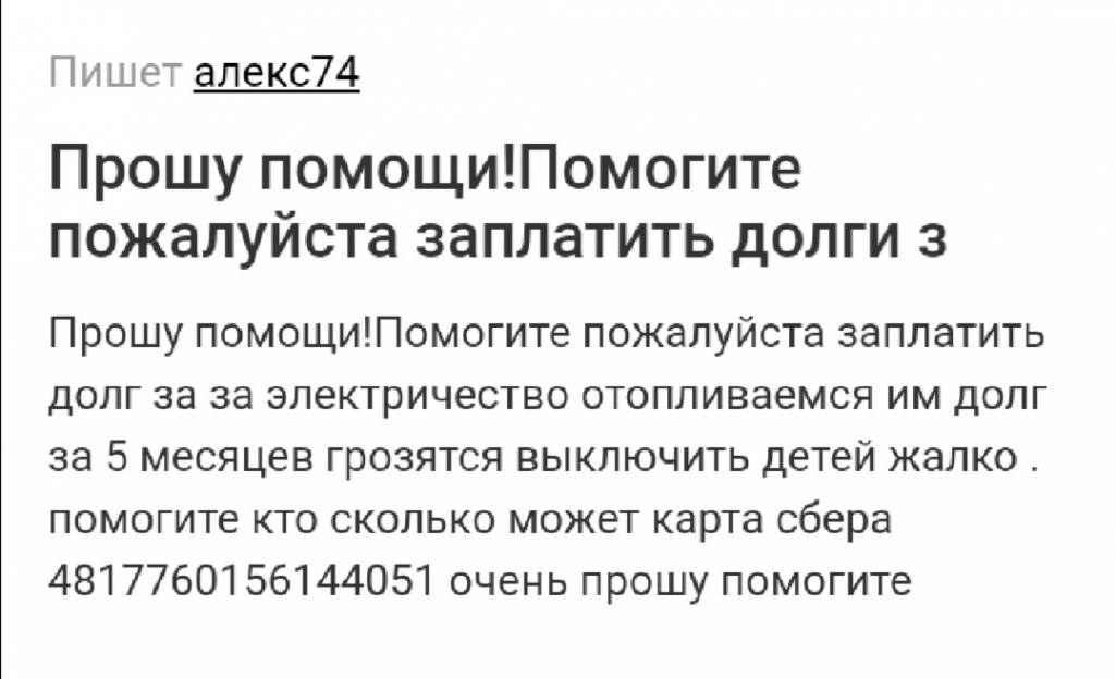 Электричество вам пока не отключили?VLAD74: 04 дек 2019, 08:09 нужно срочно 250000 т.р брал на покупку дома не хватало занял под расписку 8 проц в месяц больше не было выхода . кредит сейчас выплачиваю и проценты . денег не хватает .у нас двое детей жена работает за копейки. помогите буду рад любой сумме . работаю по найму официально работать не выгодно везде зар.плат низкие это как крик души прошу кто сколько может на яндекс кошелек 4100111164790495 сбербанк 4817760156144051 кто сколько сможет каждой копейке буду рад