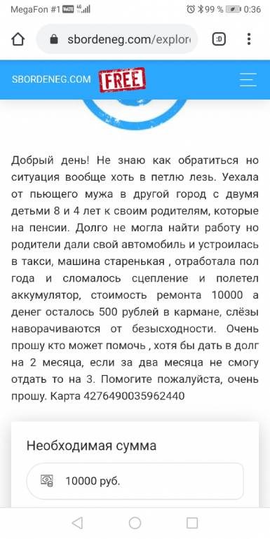 Сочувствую. У вас хоть ремонт недорогой.natalya.sobyanina: 04 дек 2019, 23:54 Доброго времени суток! Ни знаю уже куда обратиться и куда написать. В станице очень сложно найти работу и единственная кормилица в семье сломалась, у нас 2 маленьких детей, хотели взять кредит на ремонт не дают, впереди праздники, последнии две недели интернета, родных нет и попросить не у кого. Хорошая женщина помогла 2000 тысячами не хватает ещё 8000 чтобы отремонтировать нашу машину. Может кто может дать в долг. Любые 10 руб для нас сейчас деньги. Карта 4276490035962440. Если есть не равнодушные, по возможности вернём.