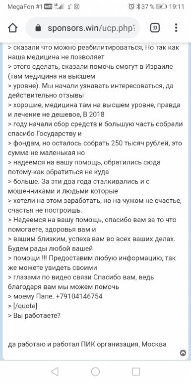 Я задала нормальные вопросы: какие фонды вам помогали и где отчеты о поступлении средств? Болтовня про "счастье не построишь" не несет никакой смысловой нагрузки.Иван250: 06 дек 2019, 18:54 Девушка описал ситуацию как было на самом деле, и не кто не делает трагедию, выписки и заключения врачей есть, фотографировали потому что содержание реанимации платное было а условия не соответствующие, не дай Бог испытать вам такие ощущения, в семье. Номер телефона оставил специально, кому нужно скину полный пакет документов, и как выше писал мошенников за два года было достаточно и людей кто хотел на этом заработать тоже !!! знаете опыта описания ситуации нет, написал так как есть и видел своими глазами.