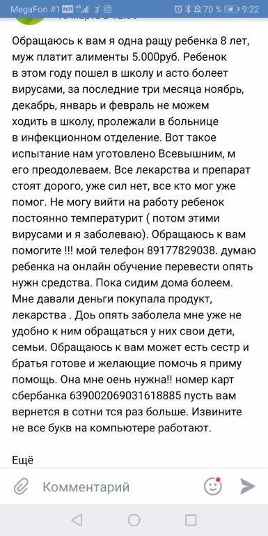доброго дня и ночи!!Одна воспитываю и ращу ребенка (родителей нет, родственников можно сказать нет). Прошу помогите собрать немного денег на обучение ребенка, очень часто болеет, то пневмания то бронхит, то затяжной трахиит... сил уже нет...все время болеем и лечимся не могу не работать не копить деньги все уходит на лекарства, нужно подключиться к онлайн школе необходимо 6500 руб. оплата за учебу + камера нужна, сканер, принтер и того всего 20 т. руб. на карту сбербанка 639002069031618885. заранее благодарю, пусть вам вернется в тысячу раз больше.
