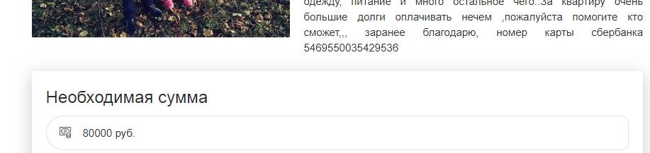 Здравствуйте!!! Прошу о помощи от добрых,хороших людей кто сколько чем сможет помочь.Просьба помогите пожалуйста, тяжёлая жизненное ситуация, нуждаемся о вашей поддержке и помощи ,для моих двоих детей,,живу с детьми,снимаем квартиру, Я мама одиночка.Не замужем, разводе, бывший муж не помогает,алименты не платит ушел от детей не живём в месте, родителей, родственников нет у нас,поддержки не от кого мы не видим,но не хватает средства.Живем в маленькой деревне проживаем на маленькой детских пособии,работы нету образование среднее,не кто с такой средней стажей не берут.Не хватает на детей на одежду, питание и много остальное чего.. Старший сын ходит в 3 класс на принадлежности нет купить не получается.За квартиру очень большие долги копаться оплатить не как не можем оплачивать нечем финансами проблемами,пожалуйста помогите кто сколько чем сможет,50,100 руб для нас и копейка будет дорога,заранее благодарны вам, номер карты сбербанка 5469550035429536 Все ещё раз спасибо!!(((