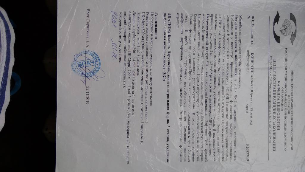 [/img][/img]Я, Кочергин А. Ю 09.06.1981 проживаю в Подольске. Срочно требуется госпитализация в отделение неврологии больницы Боткина Москвы на платной основе. В 2011 году попал в ДТП всей семьей. После неудачно проведенной операции начался некроз головки шейки бедра. 06 июля 2012 года был поставлен эндопротез шейки бедра, было проведено более пяти операций.После удара головой в ДТП имею ряд заболеваний. Болезнь Паркинсона 3 стадии, энцефалопатия посттравматическая, гипертоническая болезнь 3 стадии, укорочение правой ноги на 5 см.