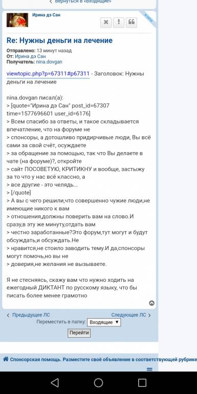 Так они из прошлого Вашего поста поняли, что нужны только деньги без предоставления выписок и справок, смет и.т.п. Причем как оказалось просто на зубы. Вы думаете ту закрытую тему никто не читал? Читатели тут одни и те же в основном.Ирина дэ Сан: 30 дек 2019, 12:54 Ошибаетесь, я уже ничего не прошу, тема закрыта, делюсь с аудиторией опытом, что это не форум спонсоров