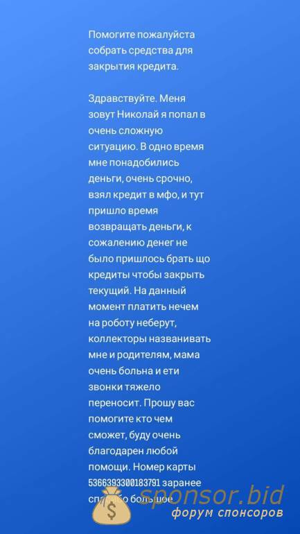 Здравствуйте. Меня зовут Николай я попал в очень сложную ситуацию. В одно время мне понадобились деньги, очень срочно, взял кредит в мфо, и тут пришло время возвращать деньги, к сожалению денег не было пришлось брать що кредиты чтобы закрыть текущий. На данный момент платить нечем на роботу неберут, коллекторы названивать мне и родителям, мама очень больна и ети звонки тяжело переносит. Прошу вас помогите кто чем сможет, буду очень благодарен любой помощи. Номер карты 5366393300183791 заранее спасибо большое.